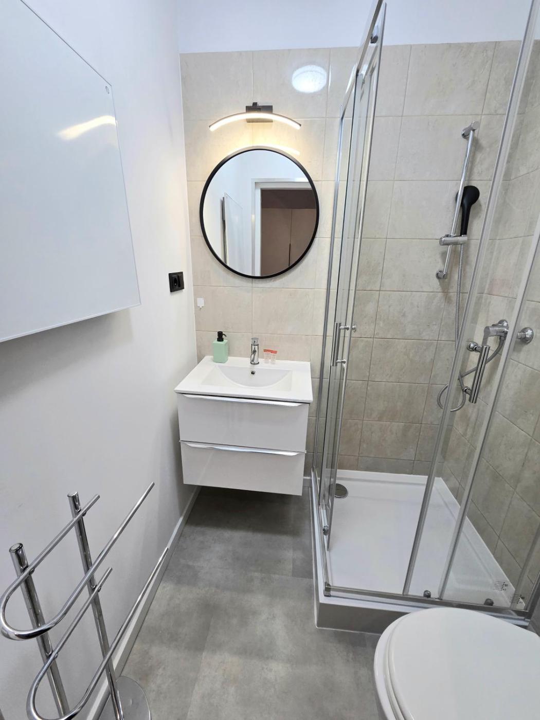 Apartament. This apartment comes with 1 living room, 1 separate bedroom and 1 bathroom with a shower and a hairdryer. The well-equipped kitchen has a stovetop, a refrigerator, kitchenware and a microwave. The apartment features a flat-screen TV with cable channels, a tea and coffee maker, a seating area, a dining area as well as ancourtyard view. The unit has 1 bed. Apartament - 2 osobowy. Powierzchnia pokoju ok.: 17 mkw.