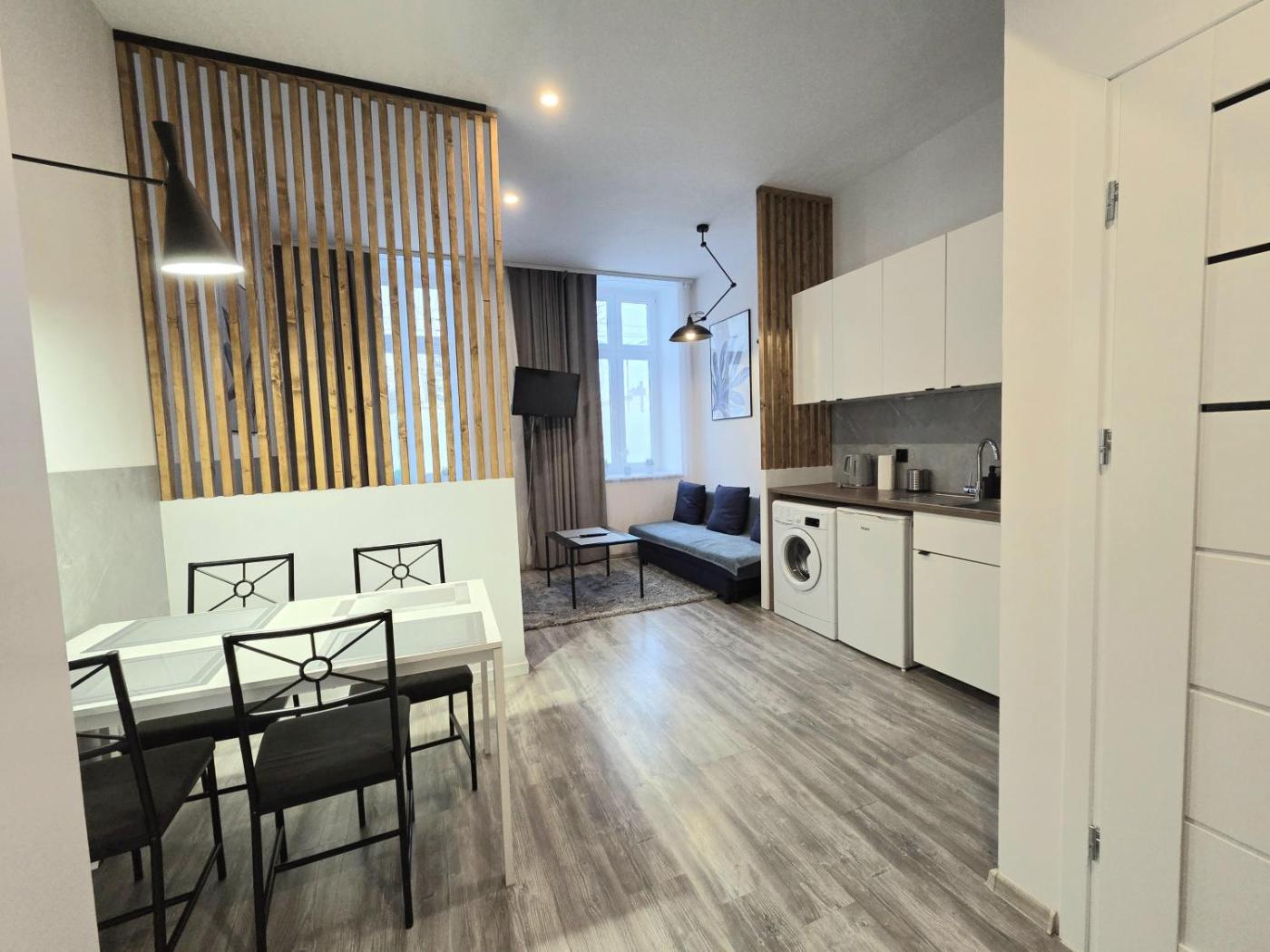 Apartament typu studio. This apartment features 1 living room, 1 separate bedroom and 1 bathroom with a walk-in shower and a hairdryer. Guests will find a stovetop, a refrigerator, kitchenware and a microwave in the well-fitted kitchen. The apartment also comes with a barbecue. The apartment features a flat-screen TV with cable channels, a washing machine, a tea and coffee maker, a seating area as well as city views. The unit has 2 beds. Apartament - 4 osobowy. Powierzchnia pokoju ok.: 25 mkw. ;