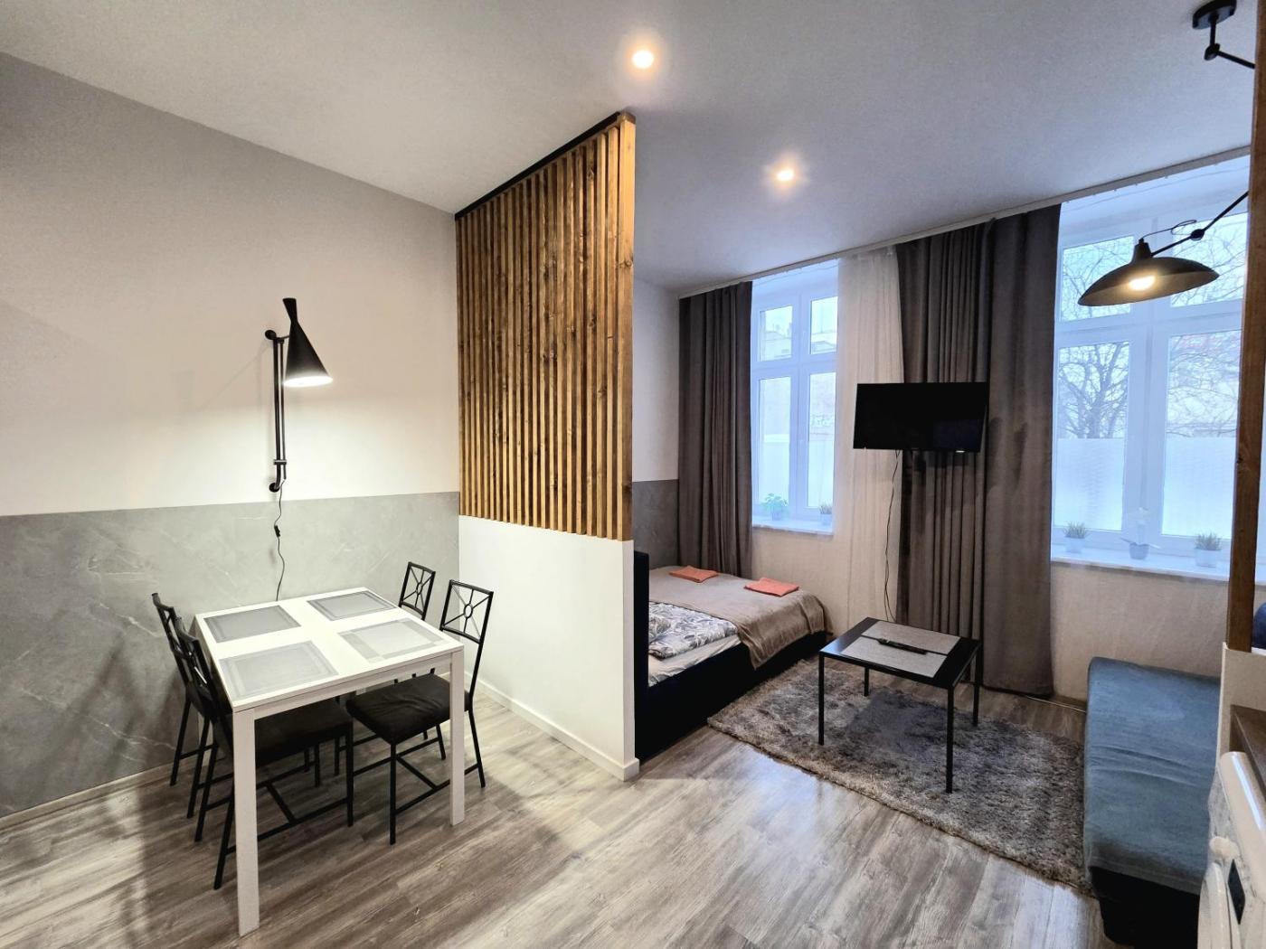 Apartament typu studio. Boasting a private entrance, this apartment comes with 1 living room, 1 separate bedroom and 1 bathroom with a walk-in shower and a hairdryer. Guests will find a stovetop, a refrigerator, kitchenware and a microwave in the kitchen. The apartment also includes a barbecue. The apartment features a washing machine, a tea and coffee maker, a seating area, a flat-screen TV with cable channels, as well as city views. The unit has 2 beds. Apartament - 4 osobowy. Powierzchnia pokoju ok.: 25 mkw. ;