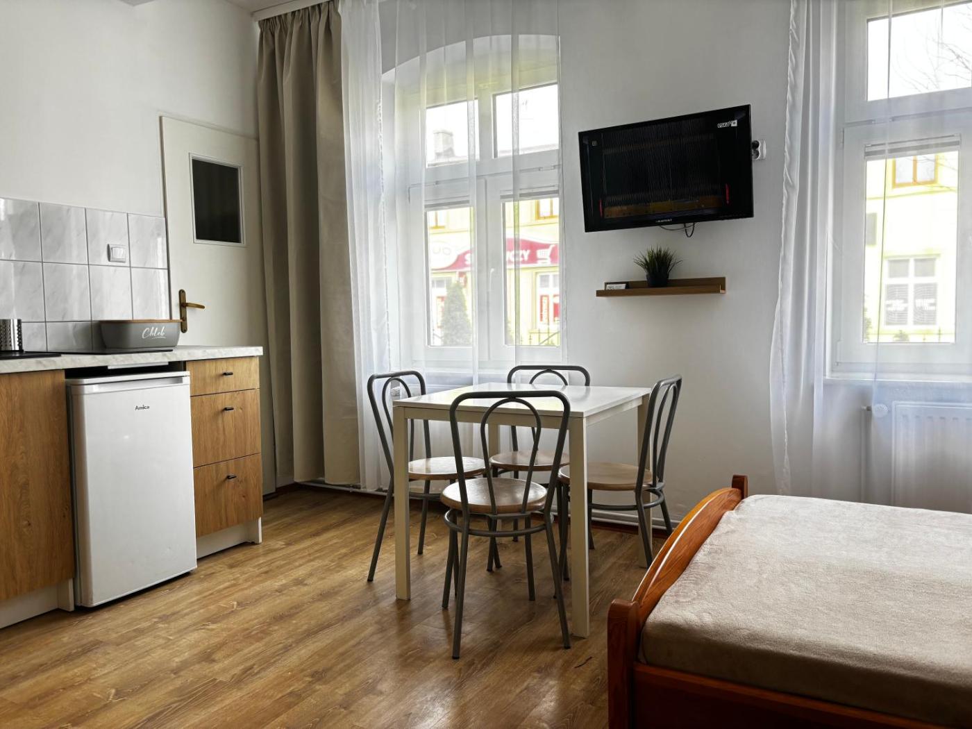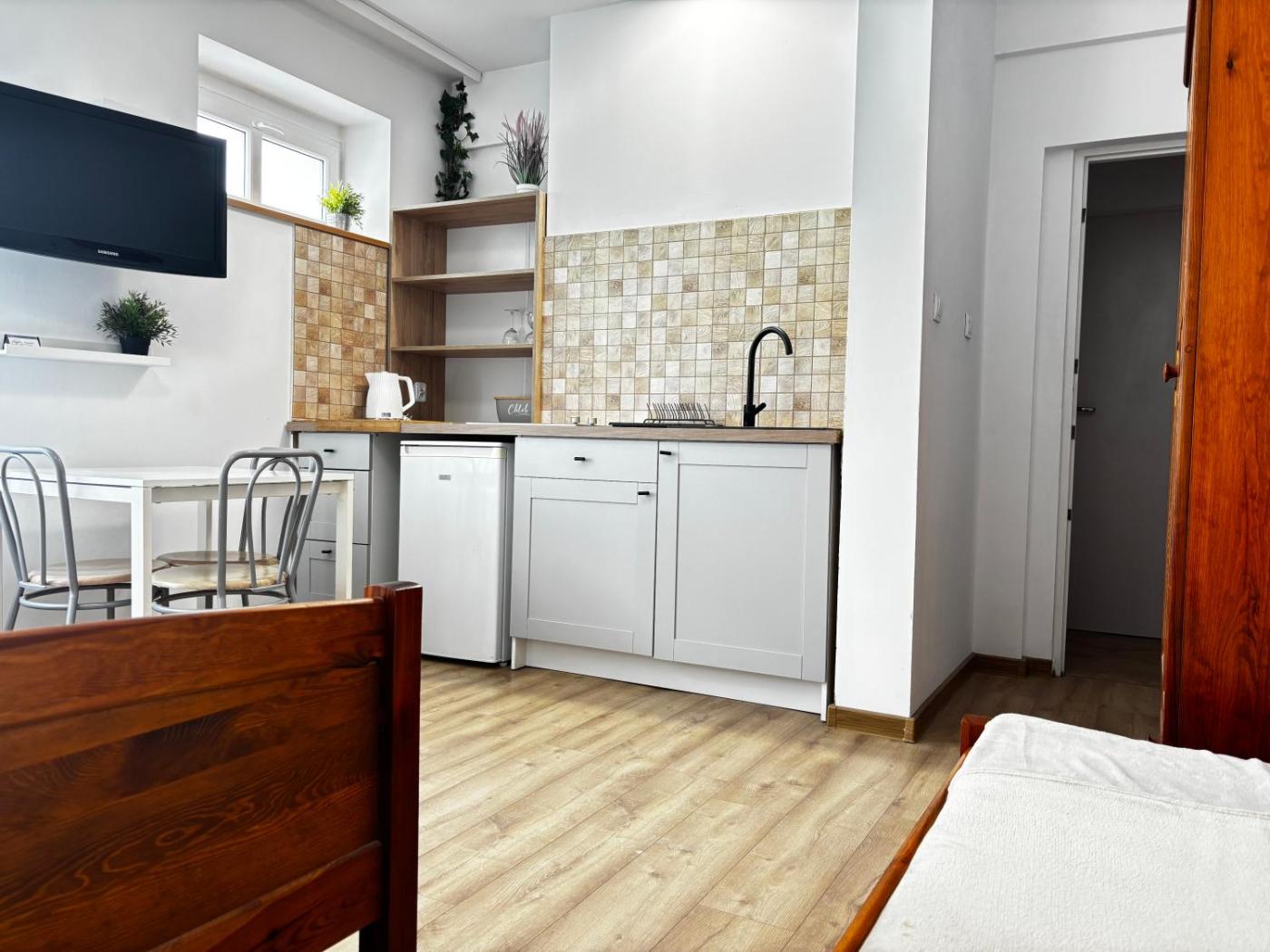 Studio. Guests will find a stovetop, a refrigerator, kitchenware and an electric kettle in the kitchen. The studio also provides guests with a barbecue. The studio provides a private entrance and a wardrobe, as well as a private bathroom featuring a shower. The unit offers 3 beds. Studio - 4 osobowy. Powierzchnia pokoju ok.: 25 mkw.